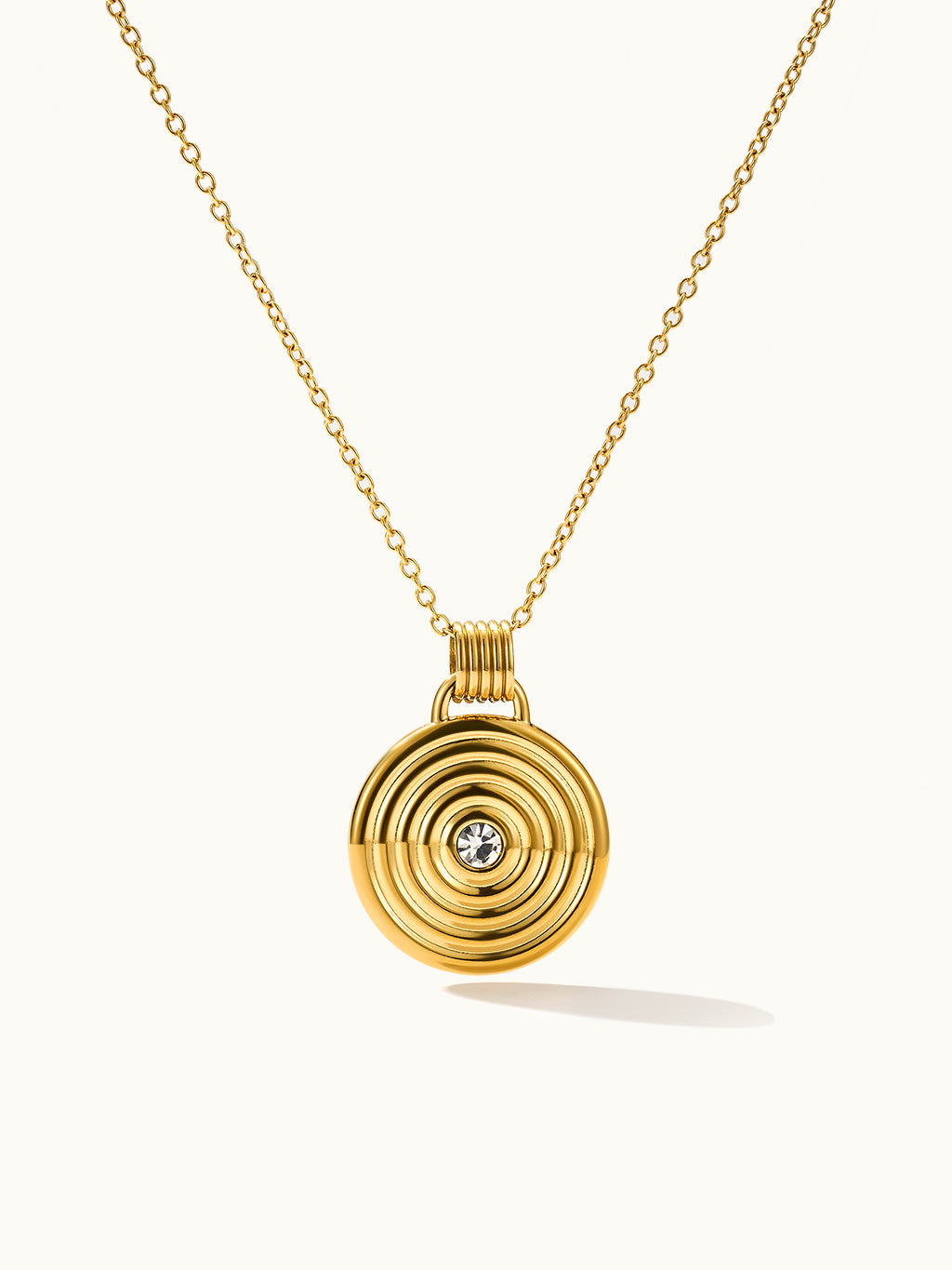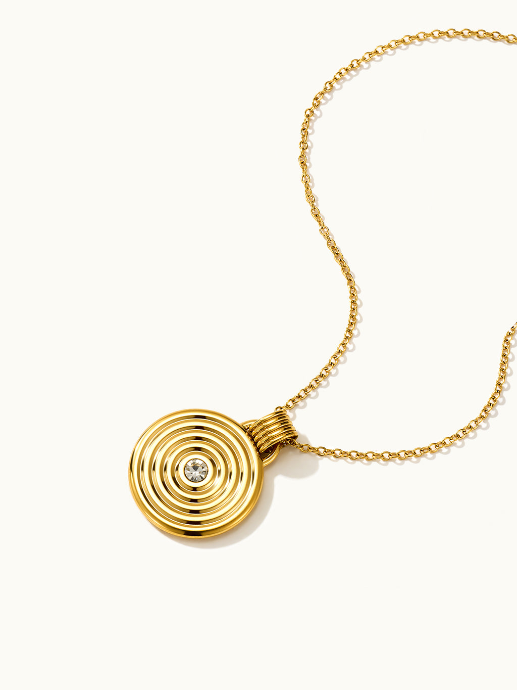 Die Annual Rings Medallion Kette verfügt über ein einzigartiges, strukturiertes Medaillon, das von Baumringen inspiriert ist und Wachstum, Stärke und zeitlose Schönheit symbolisiert.