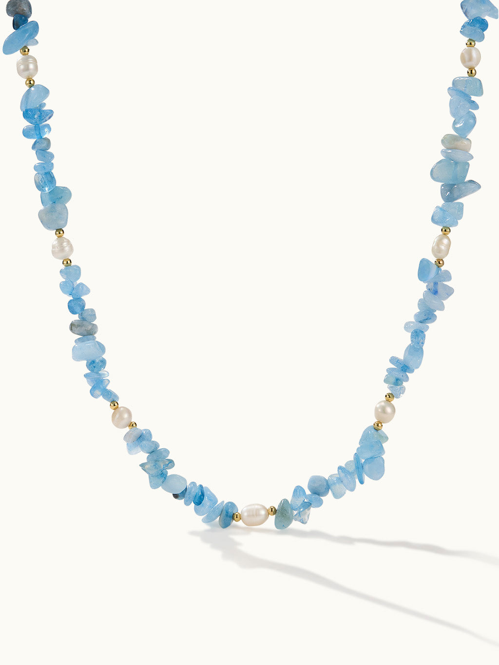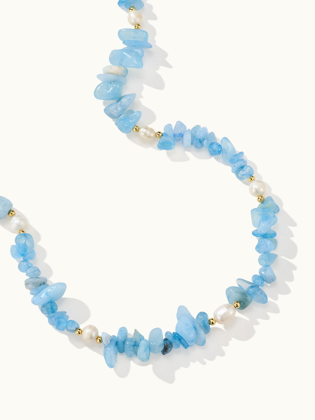 Die Aquamarine Baroque Pearl Kette kombiniert beruhigende Aquamarintöne mit einzigartigen Barockperlen für einen Look, der sowohl elegant als auch natürlich organisch ist.