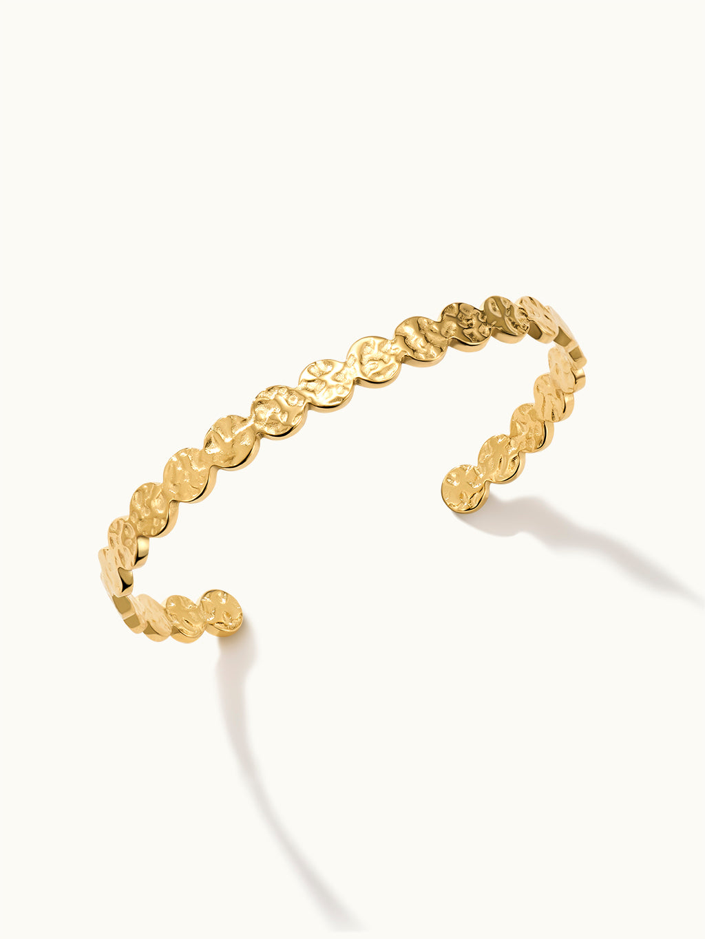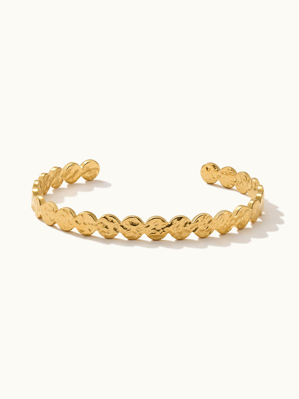 Der Bohemian Disc Hammered Armcuff besticht durch eine auffällige gehämmerte Textur mit boho-inspirierten Scheibendetails. Ein Statement-Stück, das jedem Look künstlerischen Charme verleiht.