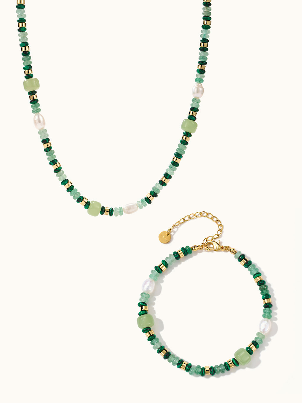 Heben Sie Ihren Boho-Stil mit diesem Boho Irregular Aventurine Pearl Strand Kette & Armband Set hervor, das Natursteine mit zeitloser Eleganz verbindet.