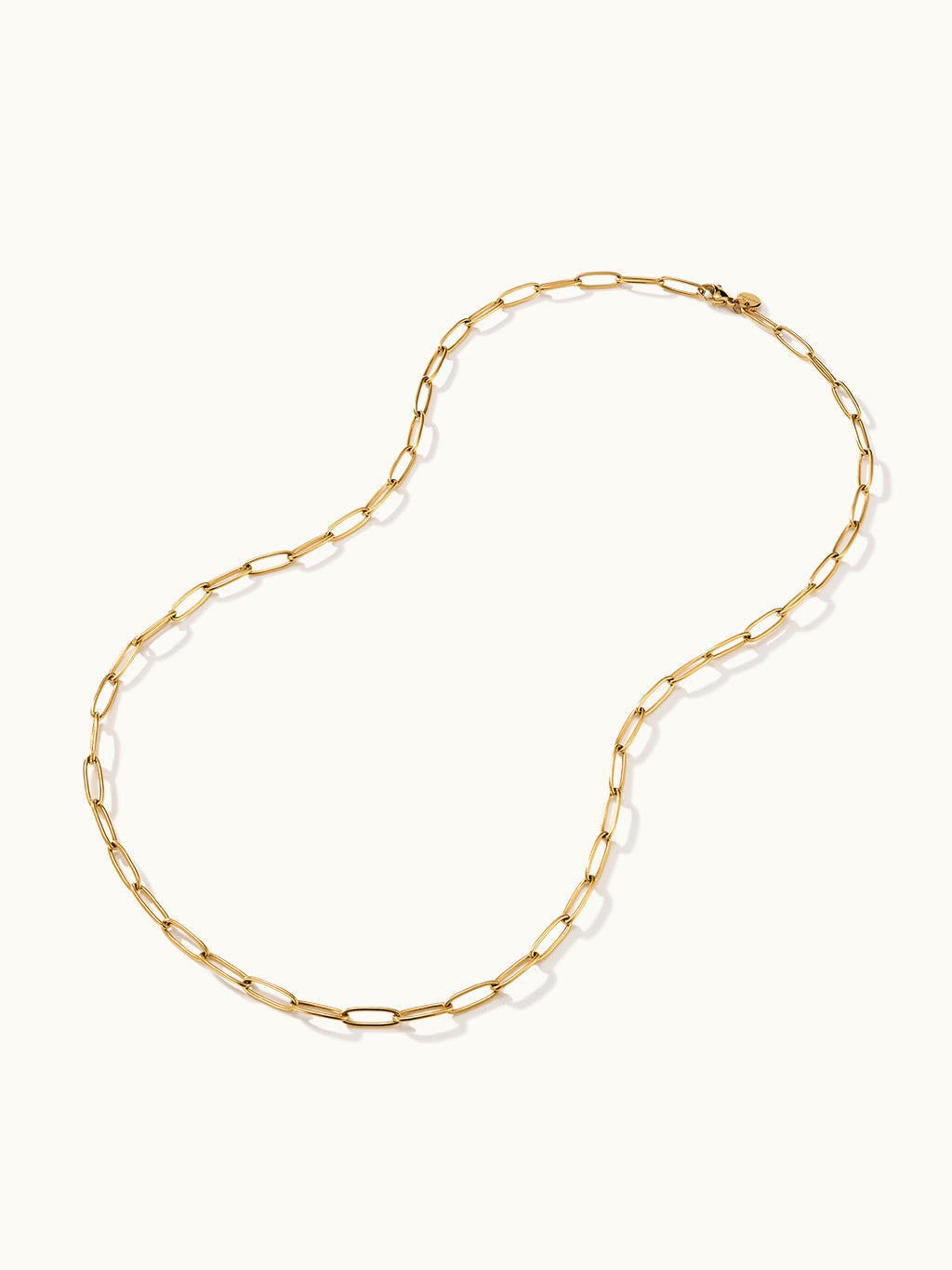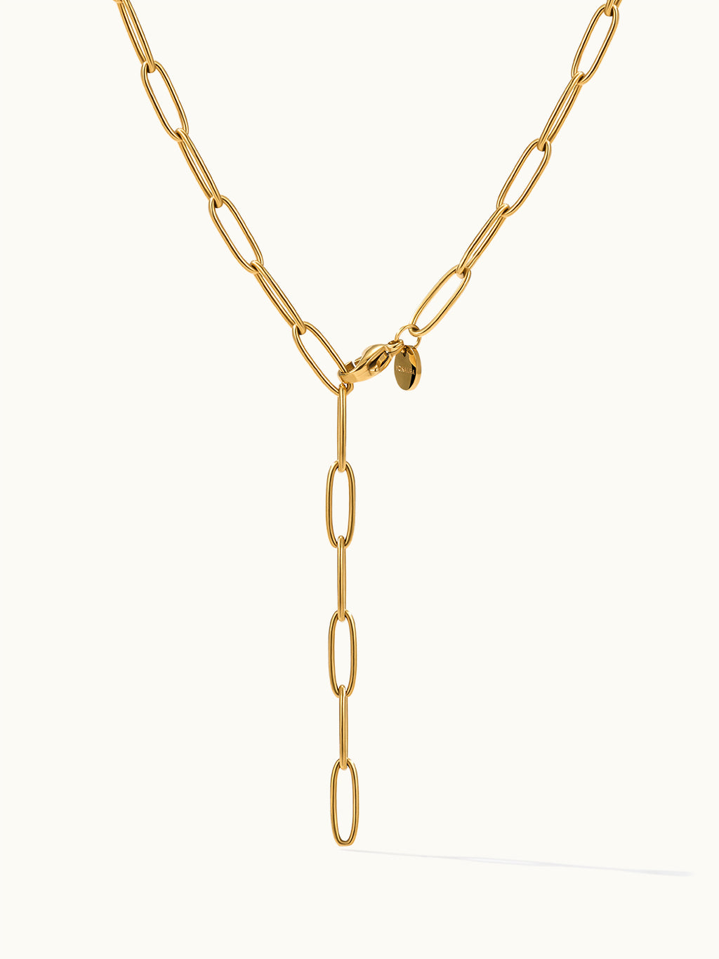 Die Charming Paperclip Y Link Kette zeichnet sich durch ein schlankes, modernes Design mit länglichen Gliedern und einer Y-förmigen Silhouette für mühelose Eleganz aus.
