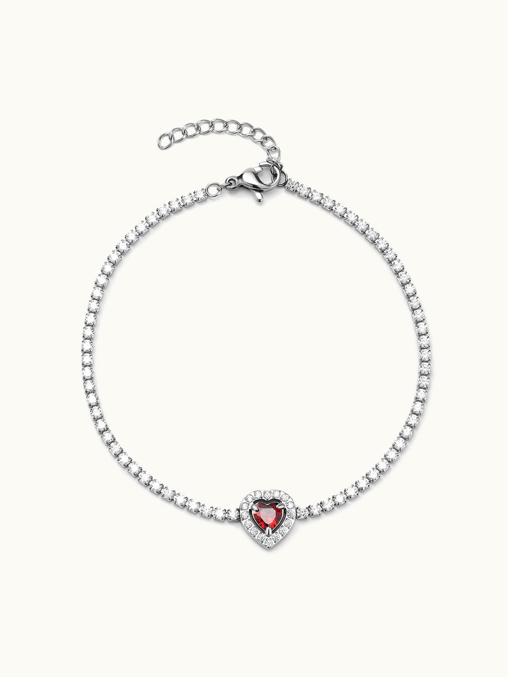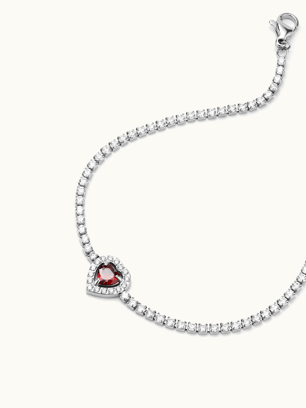 Das Crimson Heart Tennis Armband ist ein atemberaubendes Schmuckstück mit leuchtend roten Edelsteinen, eingefasst in ein elegantes Silber- oder Edelstahlband. Dieses Armband ist perfekt, um jedem Outfit einen Hauch von Eleganz zu verleihen. Es ist ein zeitloses Accessoire, das klassisches Design mit kräftiger Farbe kombiniert.