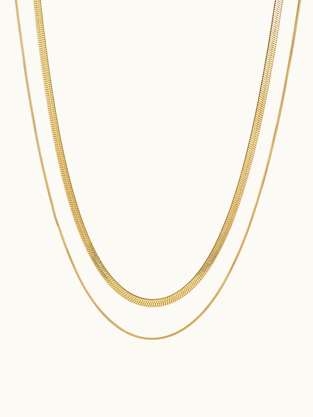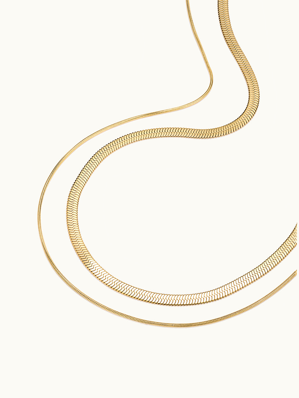 Die Double Herringbone Kette präsentiert ein elegantes, raffiniertes Design mit verflochtenen Fischgrätenketten. Ihre luxuriöse Textur und ihr Glanz machen sie zum perfekten Statement-Stück, ideal für sowohl lässige als auch formelle Outfits. Diese Halskette ist eine vielseitige Ergänzung für jede Schmuckkollektion und verleiht Ihrem Look zeitlose Eleganz.