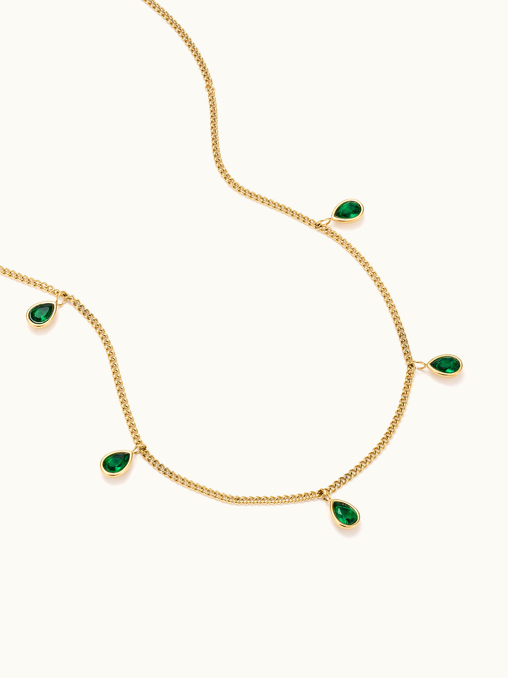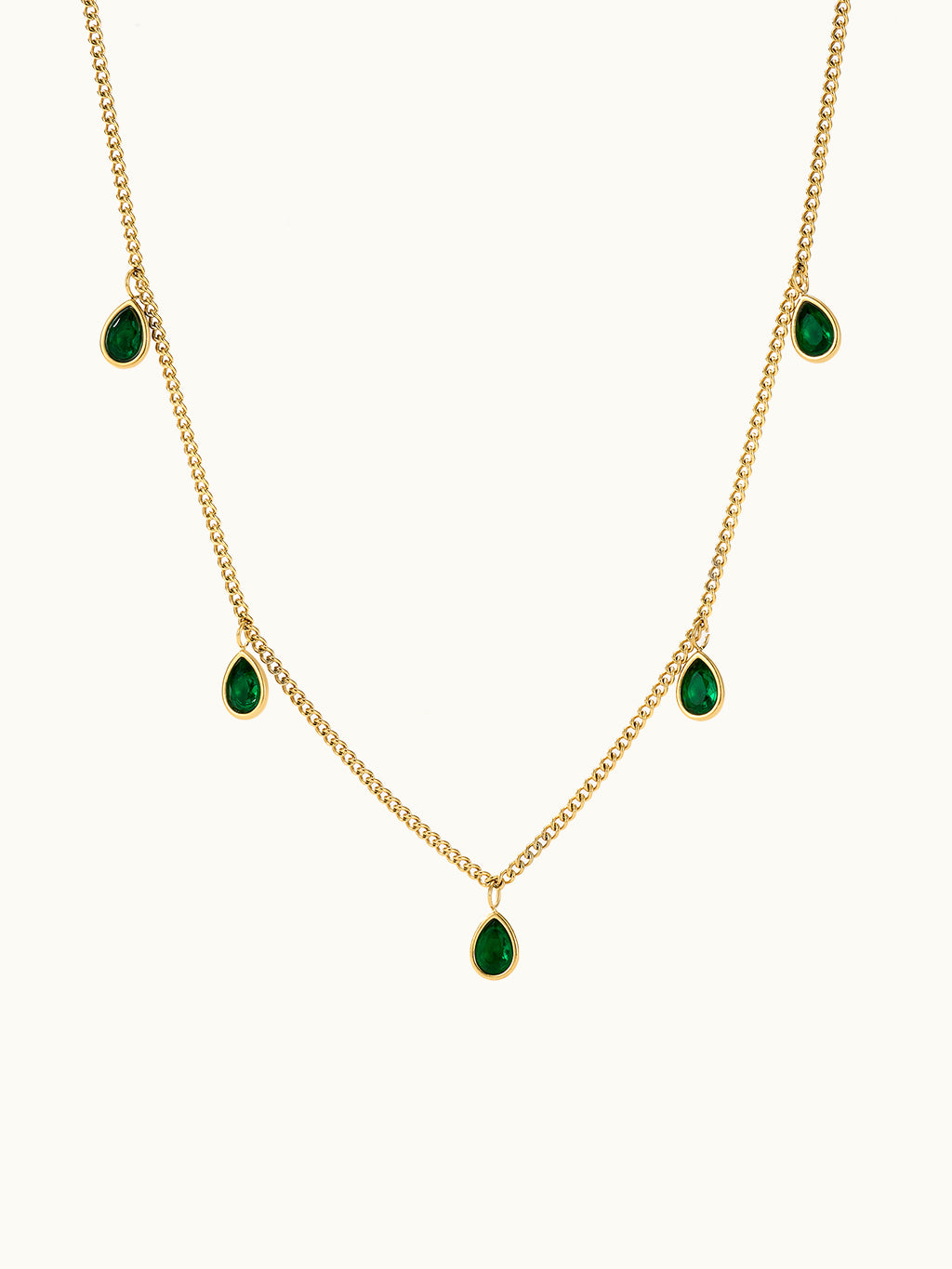 Setzen Sie ein Statement mit unserer Green Tear Drops Kette. Mit seinen eleganten tropfenförmigen Steinen verleiht dieses lebendige Stück jedem Outfit einen Hauch von Eleganz.