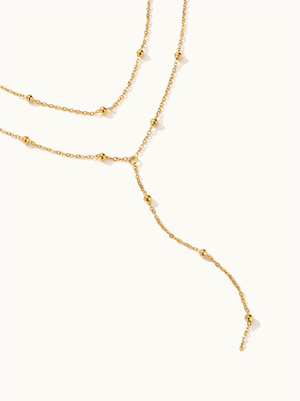 Die Lariat Y Beaded Drop Multi-Layered Kette besteht aus mehrlagigen Ketten mit zarten Perlen und einem Y-Tropfen-Design, perfekt für einen schicken, modernen Stil.