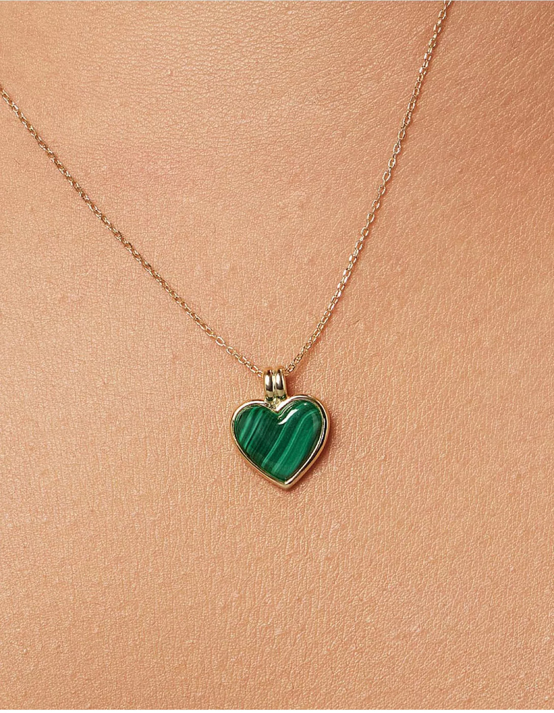 Die Malachite Heart Kette verfügt über einen atemberaubenden herzförmigen Malachitanhänger in Goldfassung und bietet zeitlose Eleganz und natürliche Schönheit.