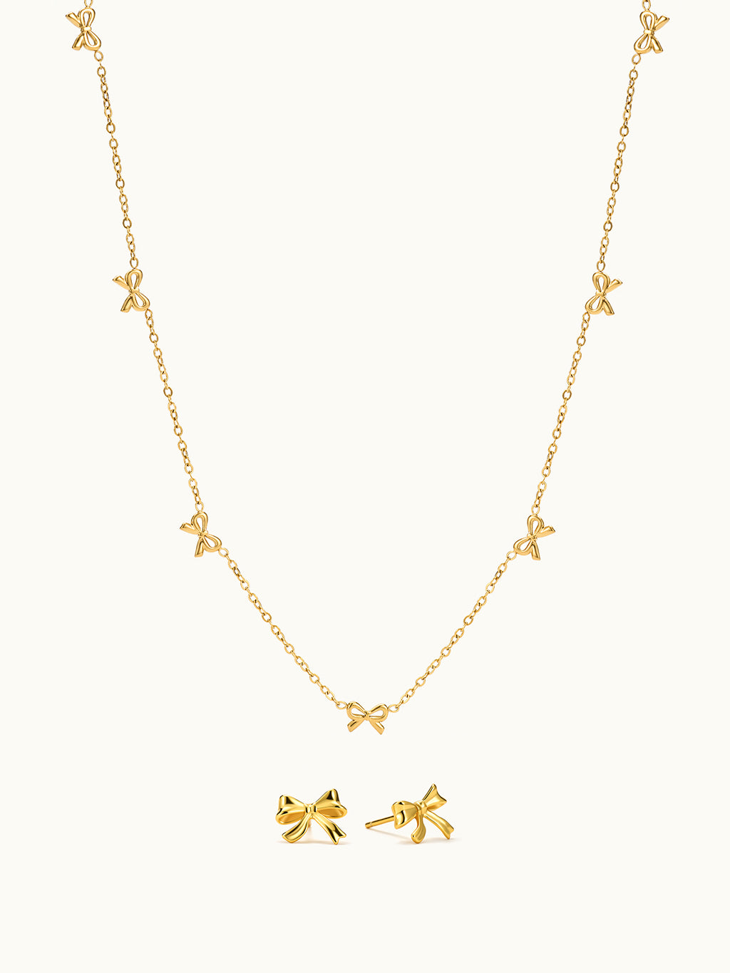 Das süße und stilvolle Mini Bow Kette & Stud Ohrringe Set verleiht jedem Outfit eine charmante Note. Zierlich, feminin und perfekt für den Alltag.