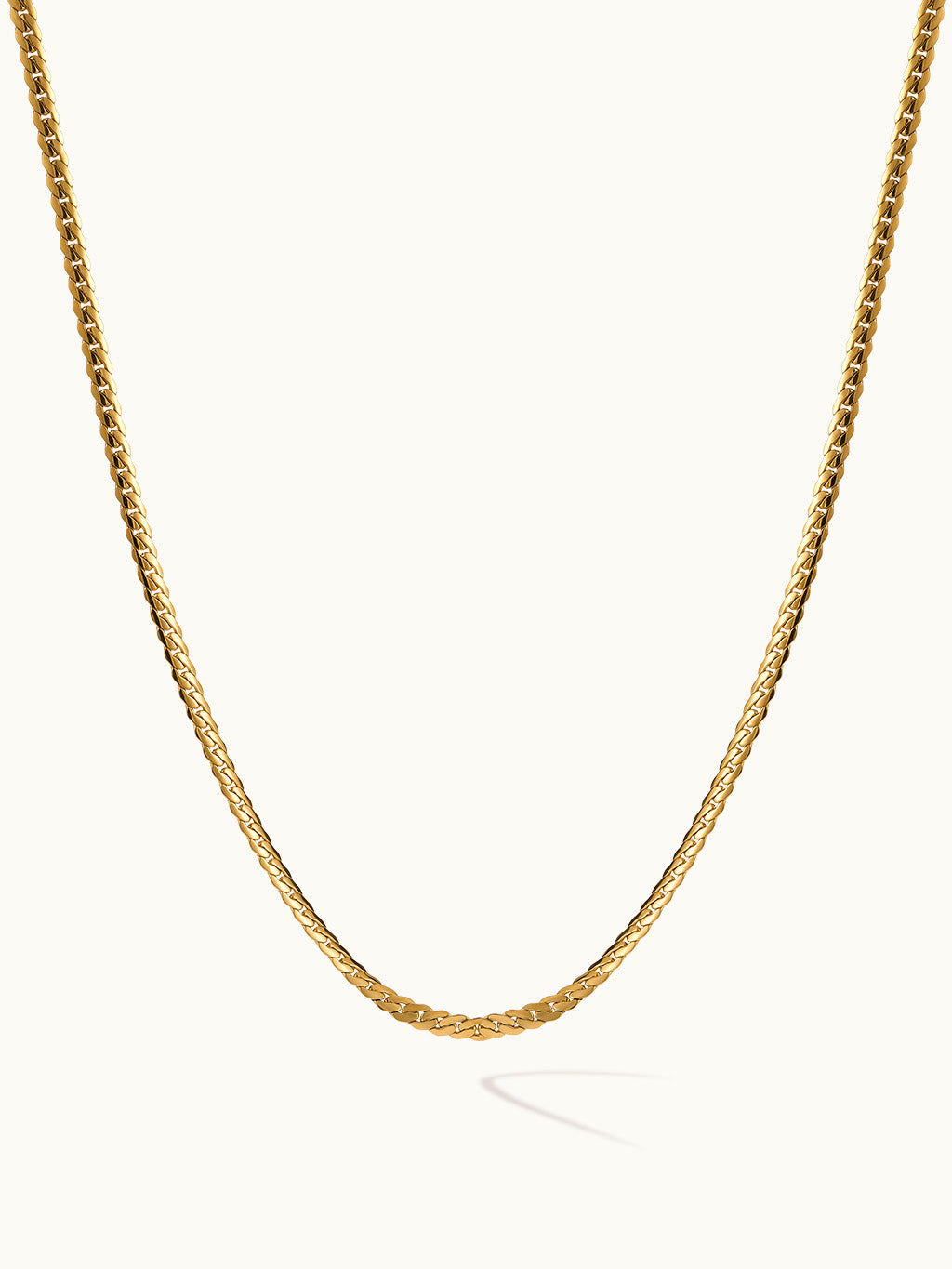 Die Minimalist 3mm Flat Snake Chain Kette bietet mit ihrem sanften Glanz schlichte, zeitlose Eleganz – perfekt zum Tragen in mehreren Lagen oder allein.