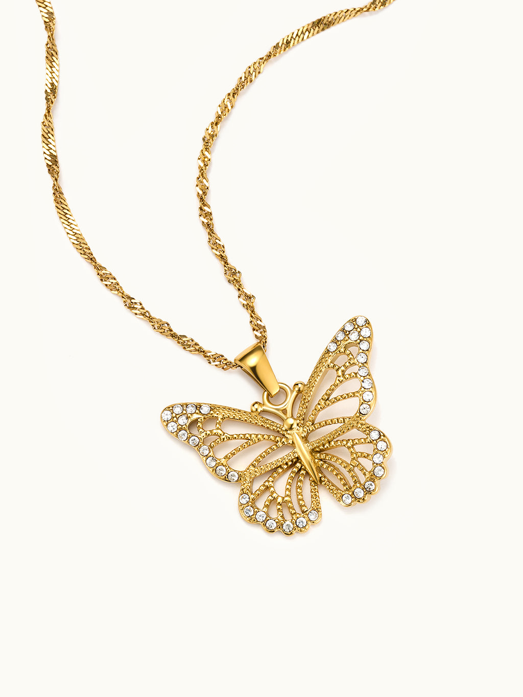 Die Pave Hollowed-out Butterfly Kette verfügt über ein zartes Schmetterlingsdesign mit funkelnden Pavé-Akzenten und ist ein anmutiges und auffälliges Statement-Stück.
