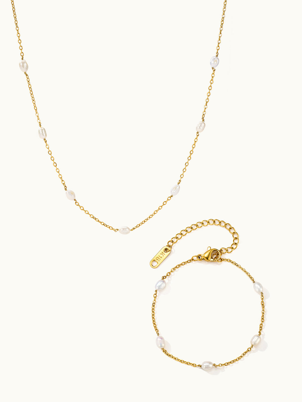 Das Pearl Chain Kette und Armband Set kombiniert klassische Perlen mit modernen Kettengliedern und bietet zeitlose Eleganz mit einem zeitgenössischen Touch.
