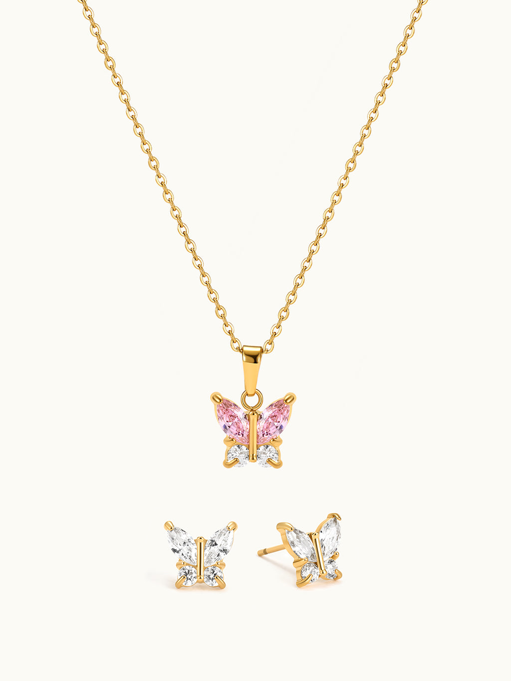 Dieses elegante Pink Butterfly Kette & Stud Ohrringe Set verleiht jedem Outfit Charme und Eleganz. Mit zarten rosa Akzenten ist dieses Schmuckset perfekt, um Ihren Look für besondere Anlässe oder den Alltag zu verschönern.