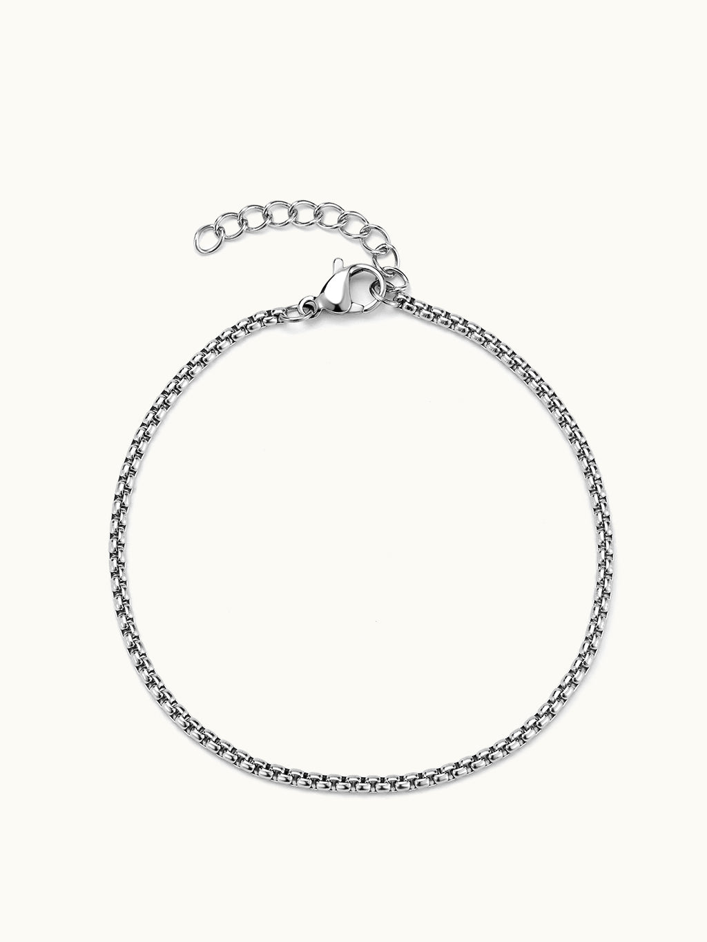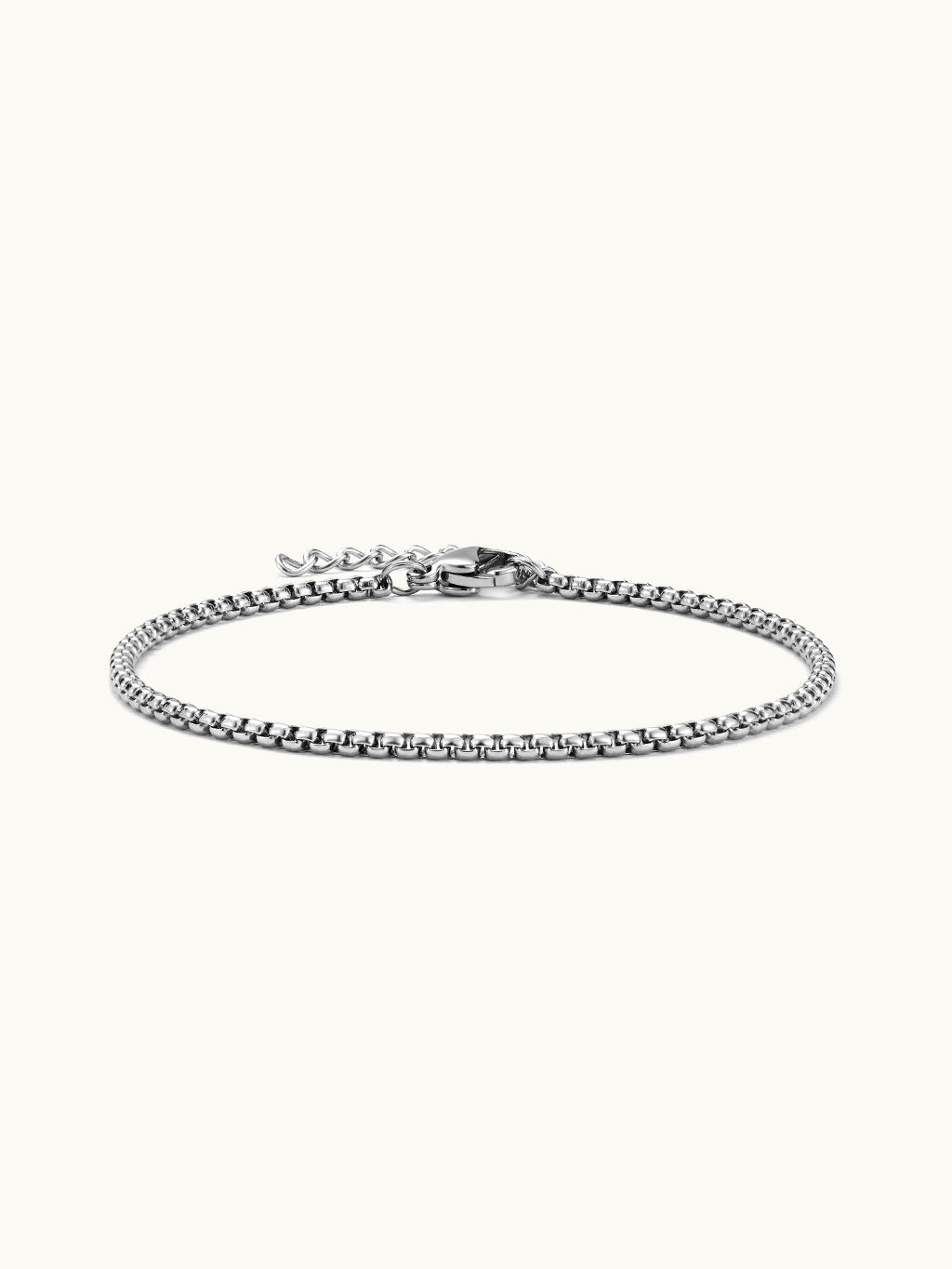 Das Round Box Chain Armband zeichnet sich durch glatte, ineinandergreifende Glieder aus, die für einen modernen, stilvollen Look sorgen. Dieses Armband aus robustem Metall eignet sich perfekt für den Alltag oder verleiht ihm einen subtilen Hauch von Eleganz.