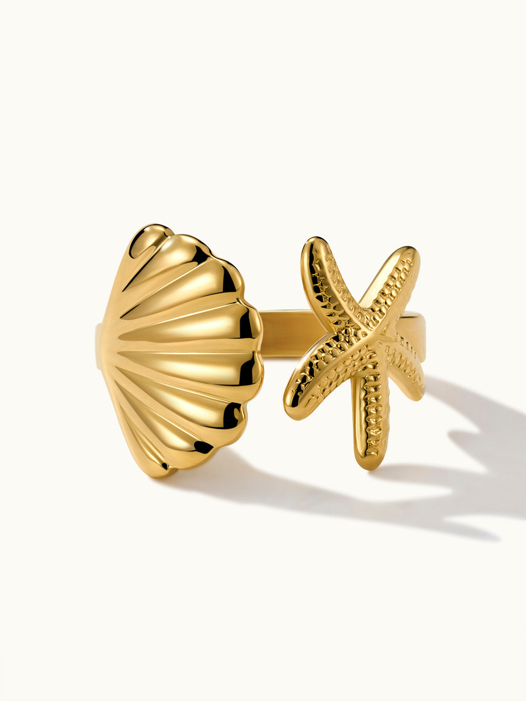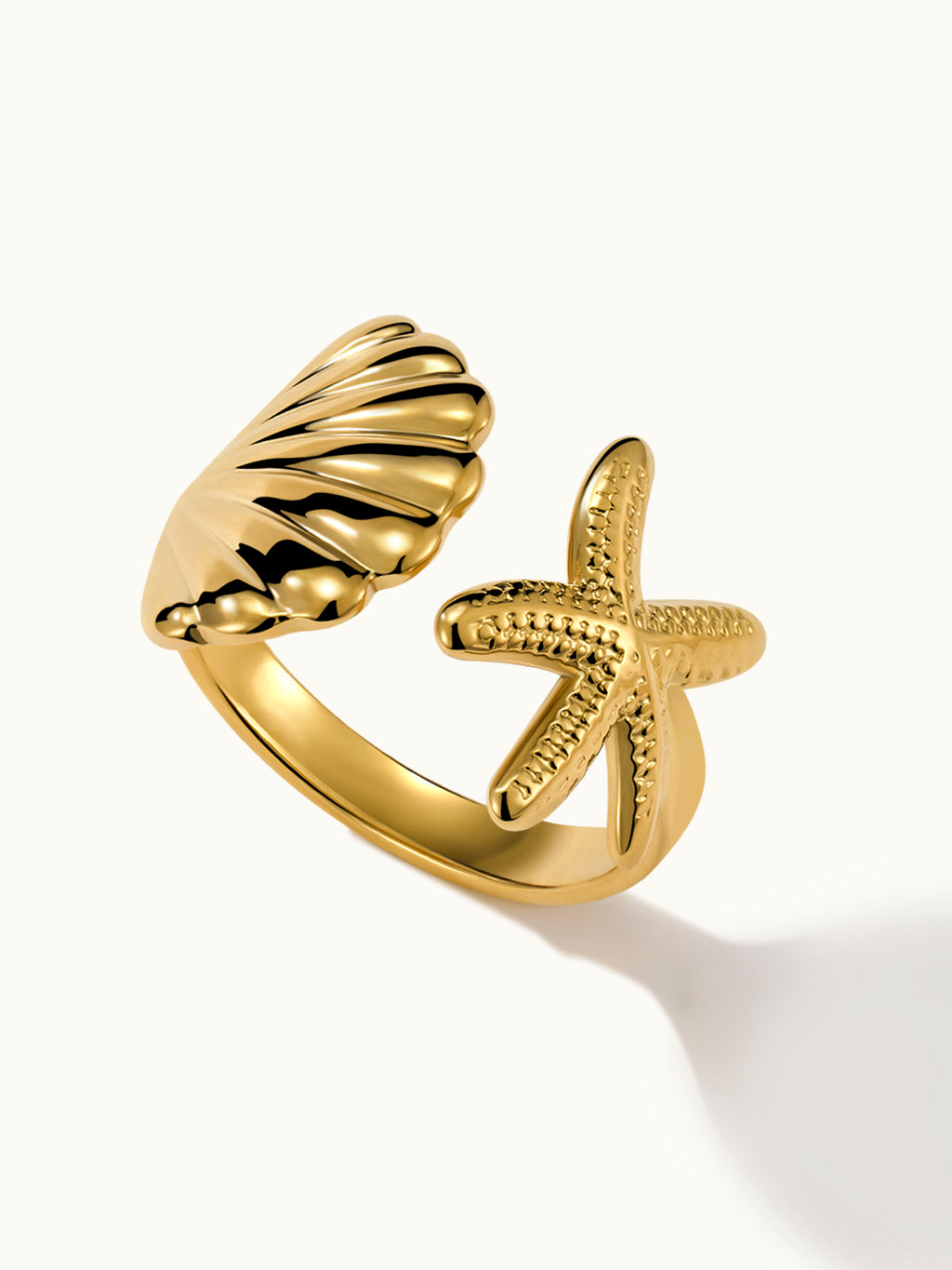 Der Shell Seastar Golden Ring fängt die vom Ozean inspirierte Schönheit mit komplizierten Muschel- und Seesterndetails in einem strahlenden Gold-Finish ein – perfekt für den Sommerstil.