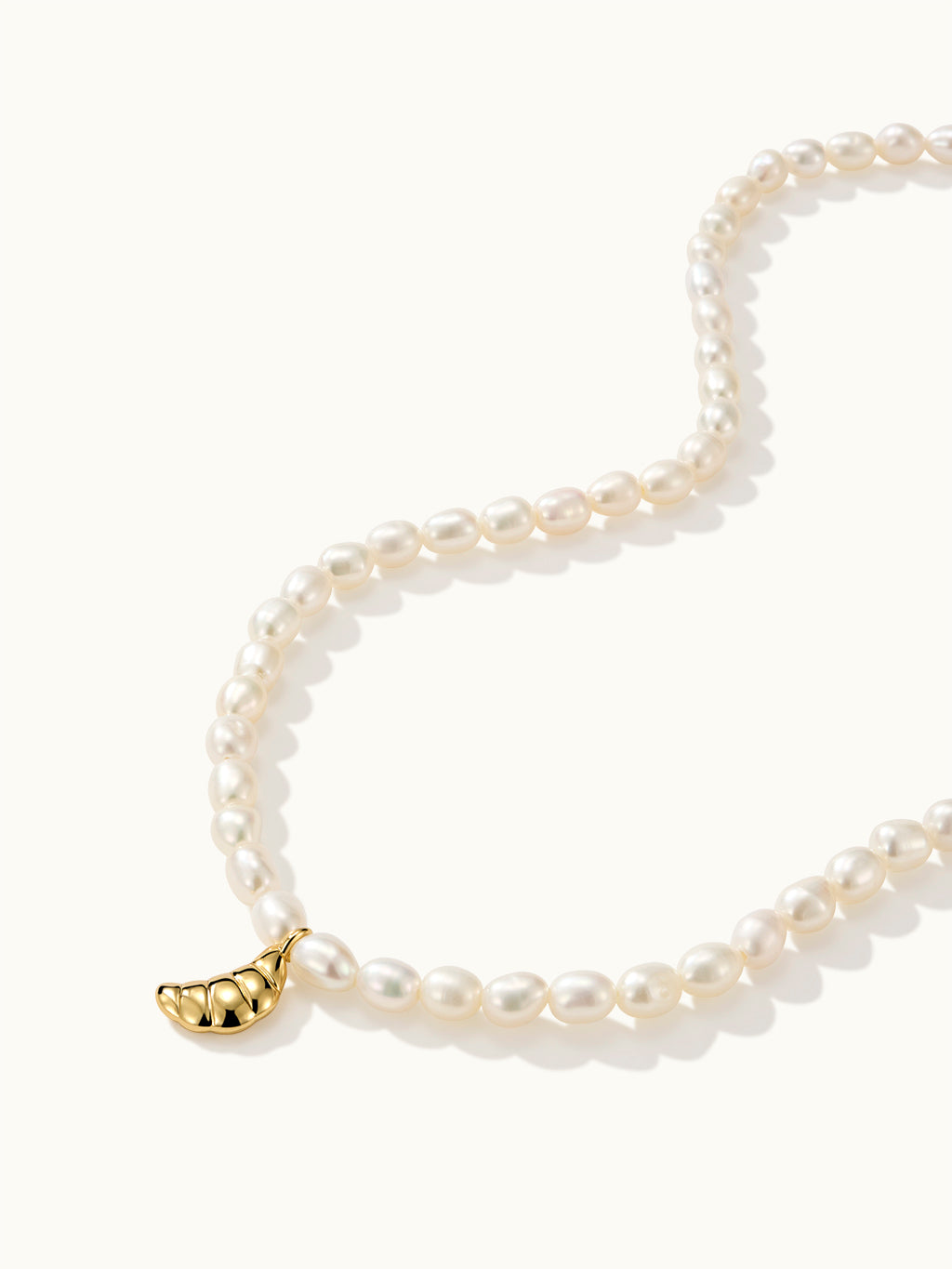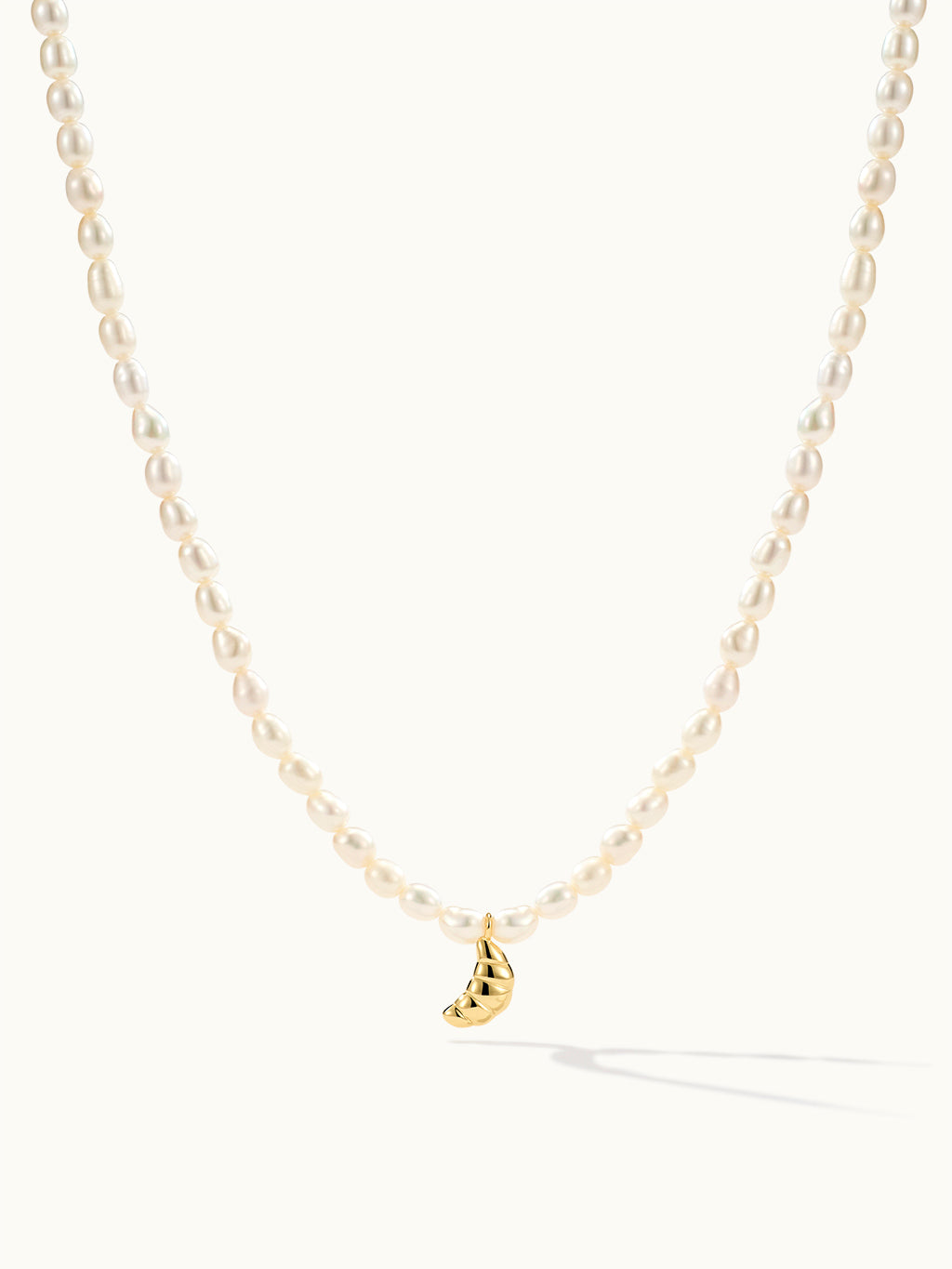 Die Single Croissant Charm Pearl Kette vereint Eleganz und Verspieltheit und besteht aus glänzenden Perlen, die mit einem schicken Croissant-Anhänger für einen modernen Stil verziert sind.