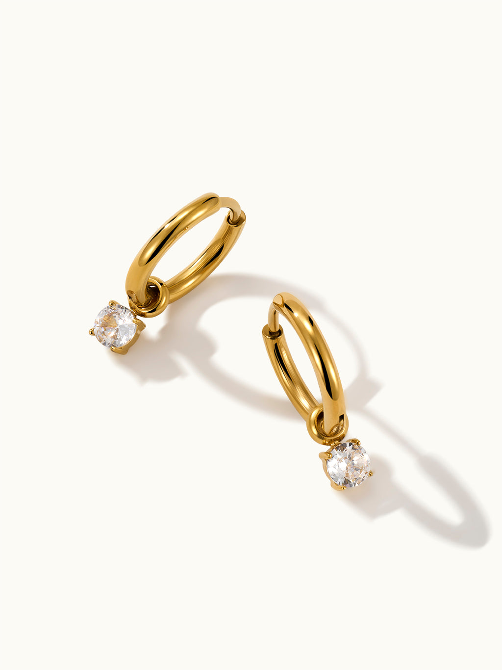 Die Solitaire Round Zirkonia Dangle Ohrringe präsentieren brillante runde Steine in einem eleganten Tropfendesign, perfekt für zeitlose Eleganz und Glanz.