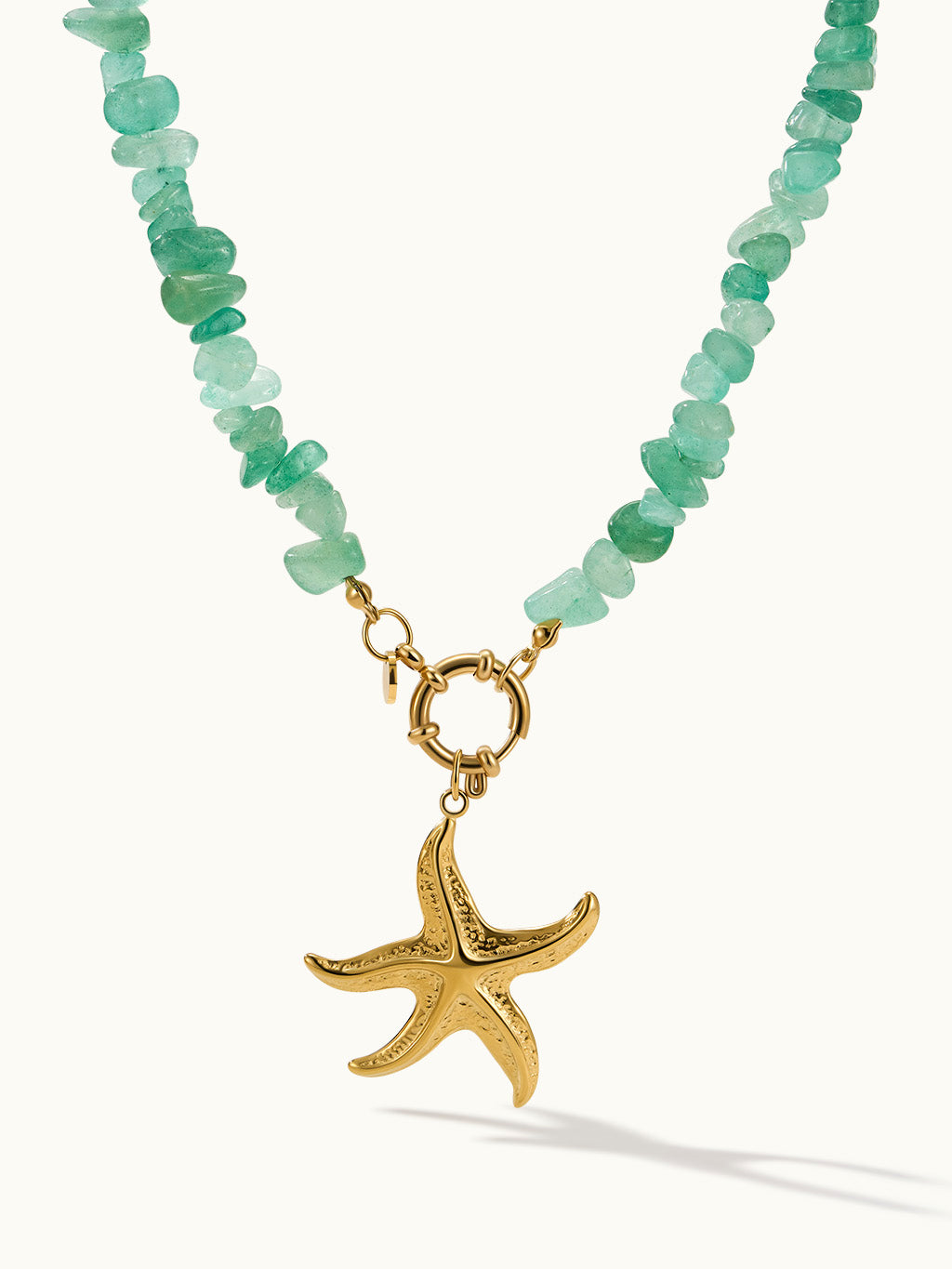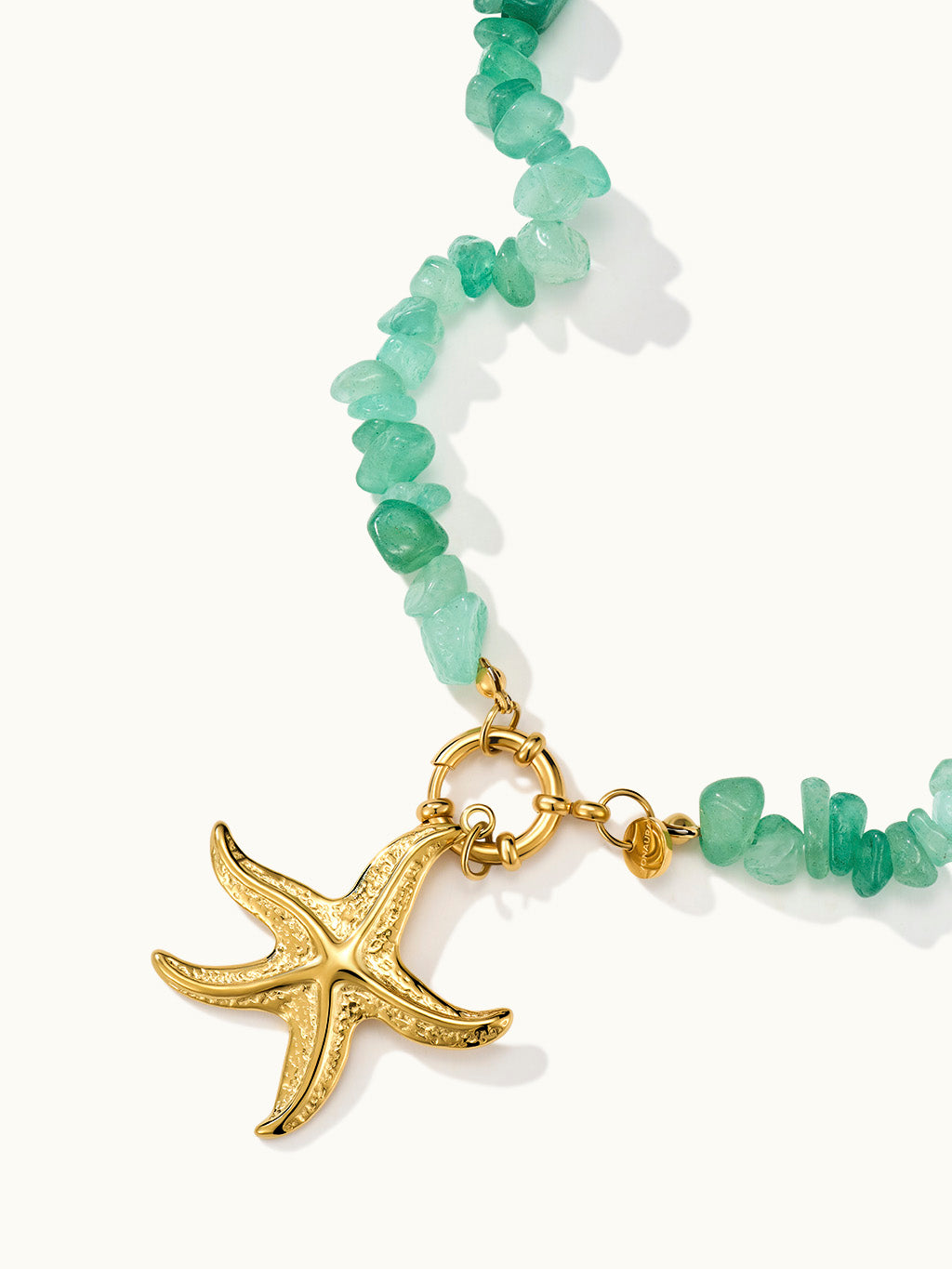Die Starfish Emerald Beaded Kette besteht aus leuchtend grünen Perlen und einem bezaubernden Seestern-Anhänger und verleiht jedem Look Küsteneleganz. Die Kette ist mit einem feinen Nylonfaden (Fischschnur) gefertigt, was ihr ein besonders filigranes Design verleiht. Wir empfehlen, beim Tragen vorsichtig zu sein und starkes Ziehen zu vermeiden.