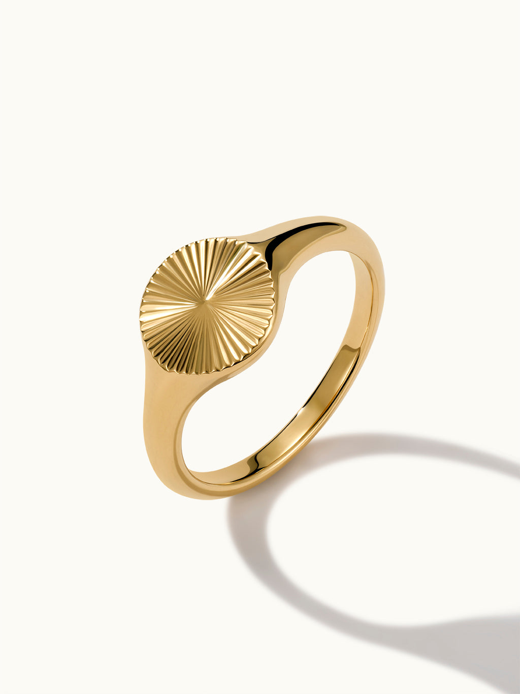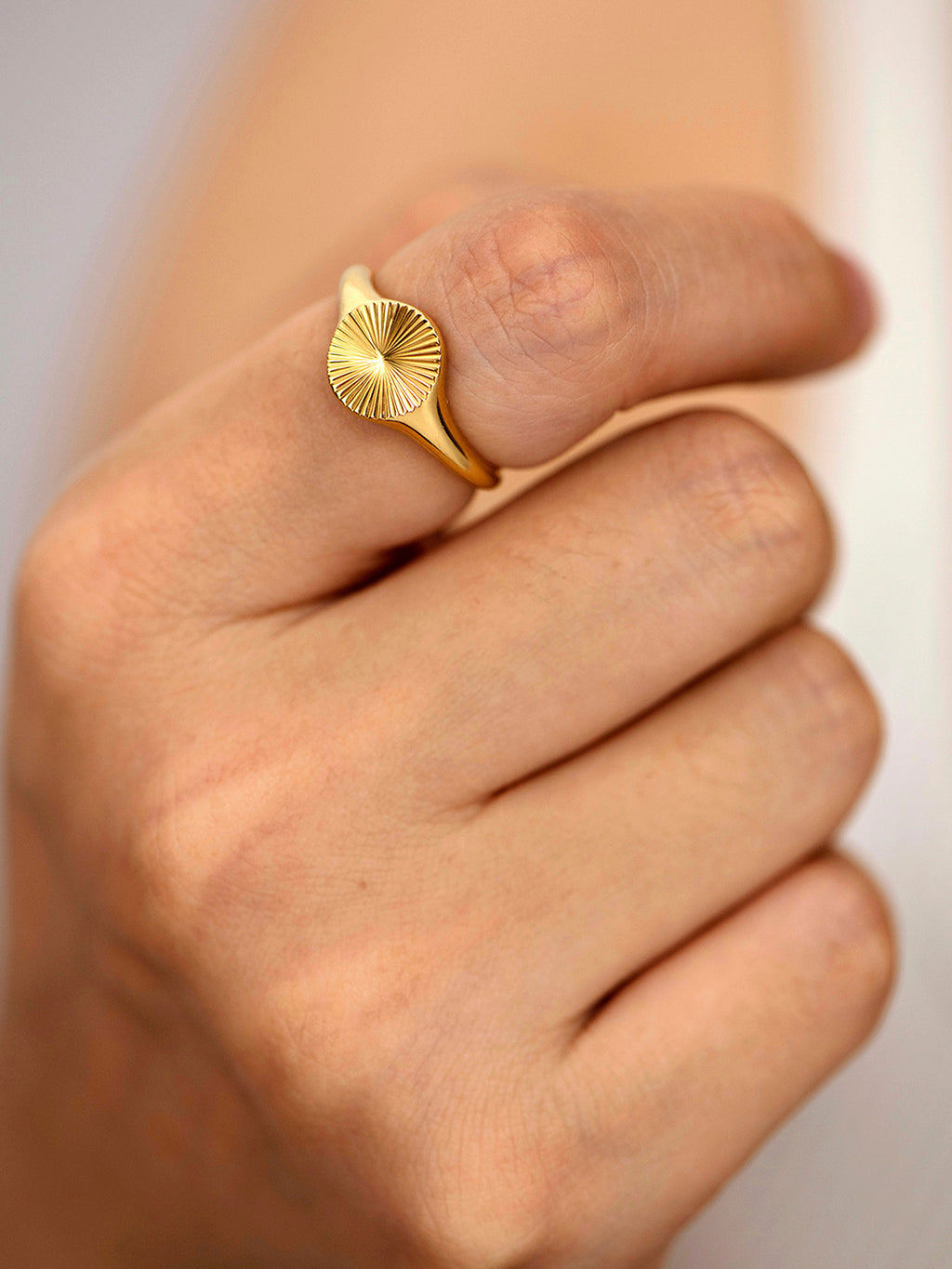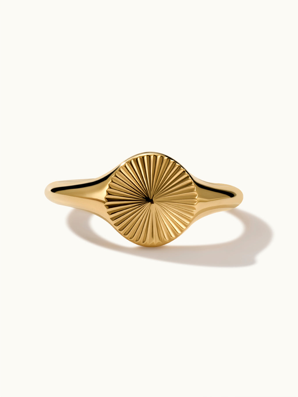 Setzen Sie mit dem Sunburst Radial Signet Ring ein starkes Statement. Das strahlende Sunburst-Design verleiht diesem Schmuckstück Vintage-Charme und modernes Flair.