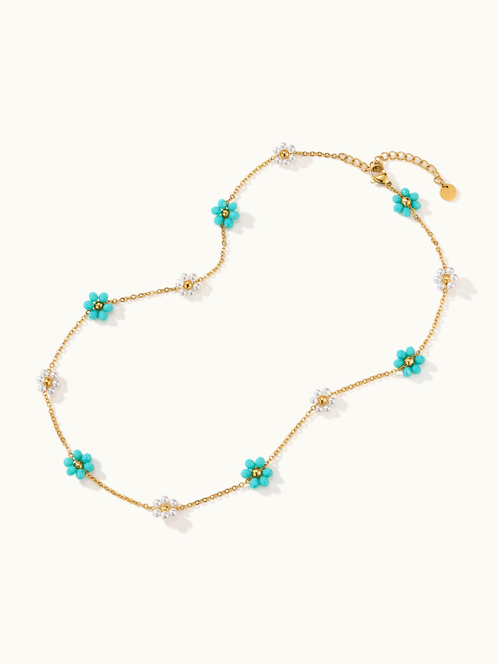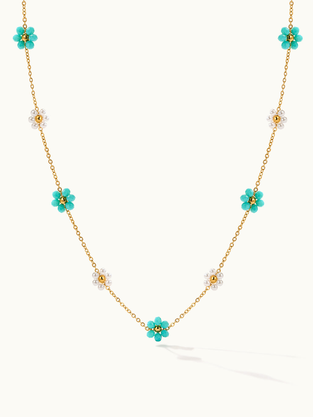 Die Sunlit Daisy Flowers With Pearl Kette kombiniert zarte Gänseblümchenanhänger mit glänzenden Perlen für einen frischen, femininen und zeitlosen Look. Perfekt für den Alltag oder besondere Anlässe.