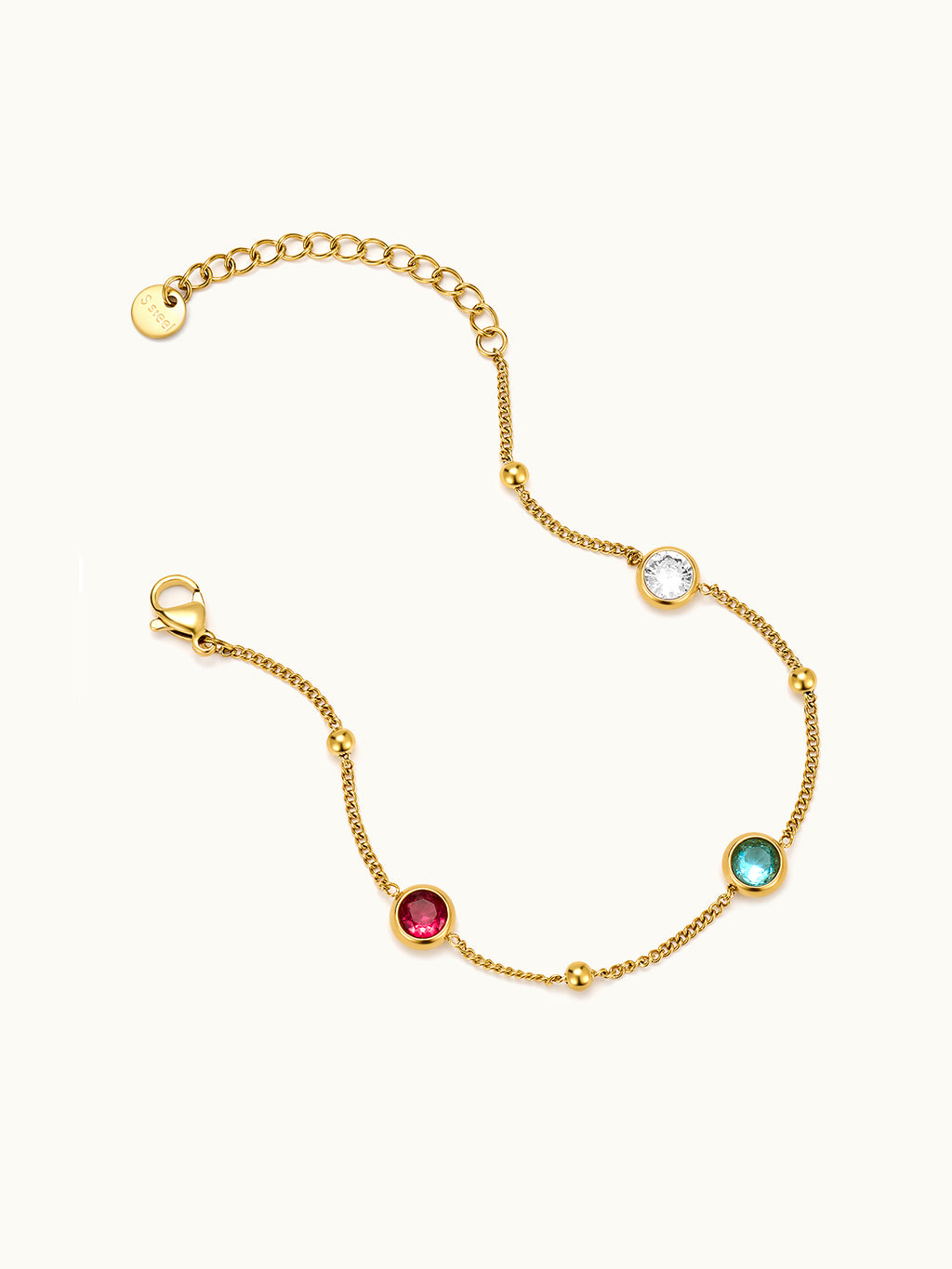 Feiern Sie bedeutungsvolle Momente mit dem Three Birthstone Exquisite Armband. Mit drei personalisierten Edelsteinen ist dieses elegante Stück perfekt für jeden Anlass.