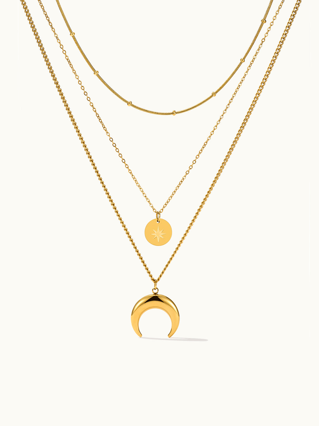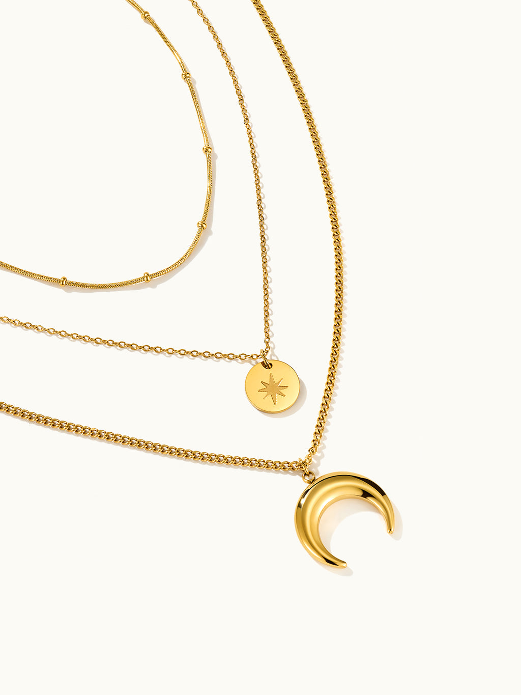 Die Three Layer Star Moon Design Kette kombiniert himmlische Eleganz mit mehrlagigem Stil und ist perfekt, um jedem Outfit eine kosmische Note zu verleihen.