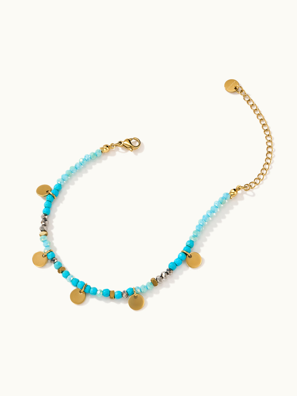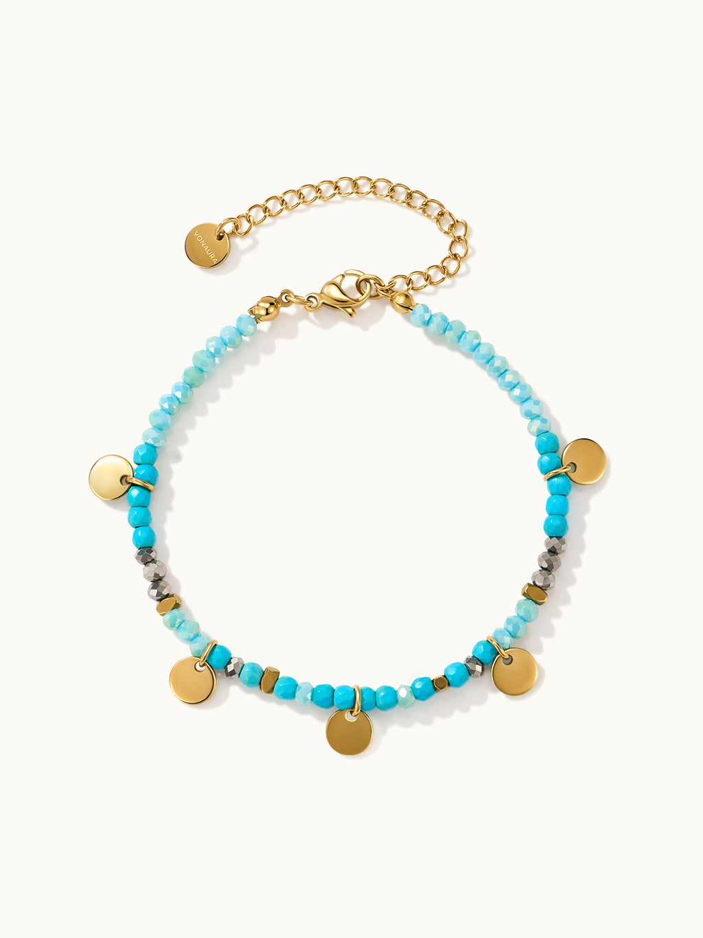 Verleihen Sie Ihrem Look mit unserem Turquoise Bead With Coin Armband einen Hauch von Boho-Charme. Mit leuchtend türkisfarbenen Perlen und einem Münzanhänger, perfekt zum Stapeln oder alleinigen Tragen.