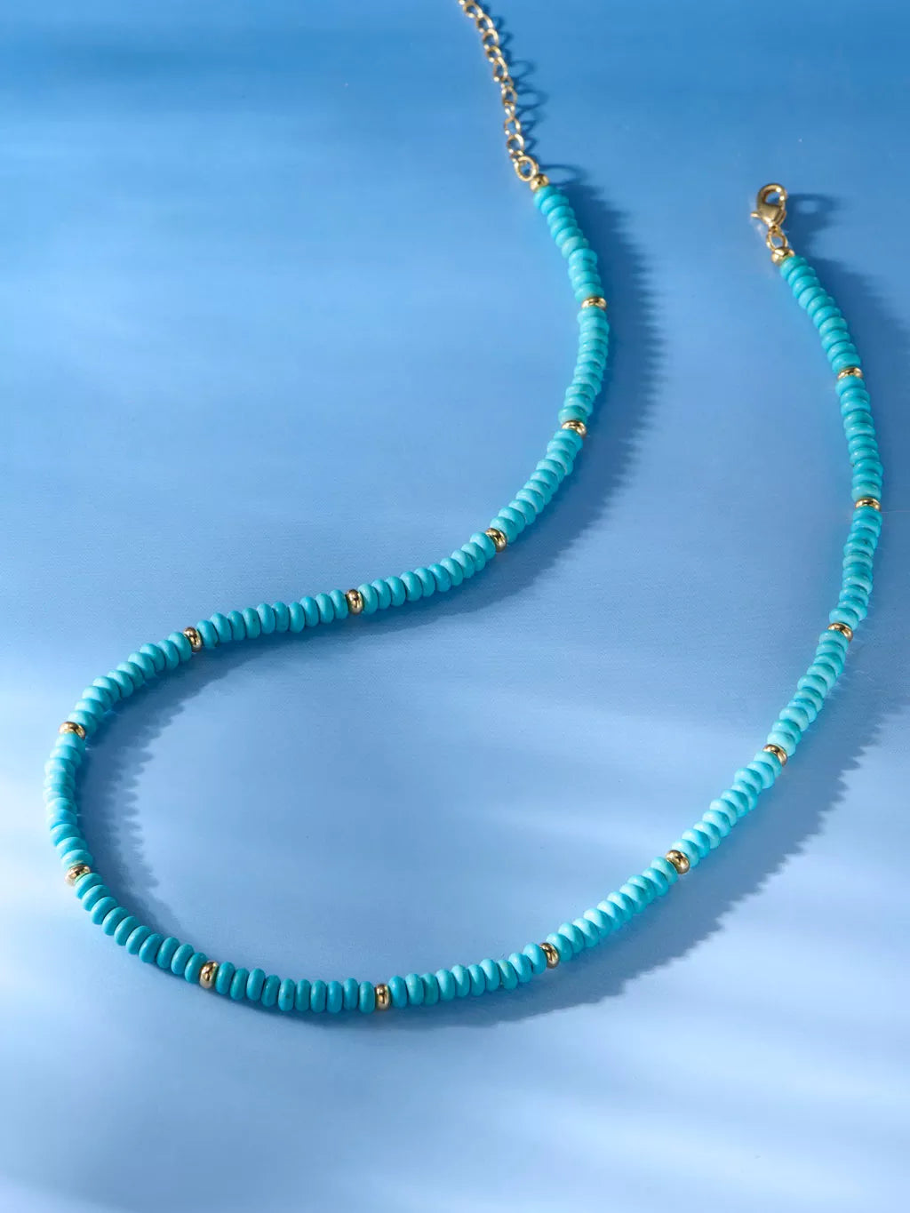 Fügen Sie mit der Turquoise Rondelle Beaded Kette einen Farbtupfer hinzu. Sie besteht aus leuchtend türkisfarbenen Perlen in einem klassischen, minimalistischen Strangdesign.