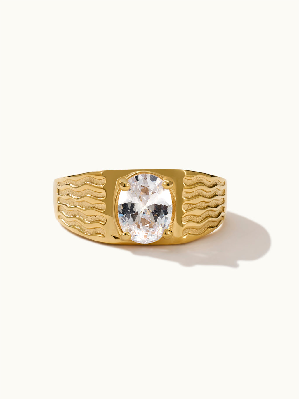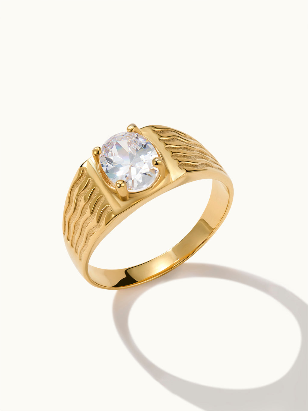 Der Twill Solitaire Oval Zirkonia Ring besteht aus einem schimmernden Zirkonia im Ovalschliff auf einem gedrehten Twill-Band und verbindet Eleganz mit einem modernen Touch.