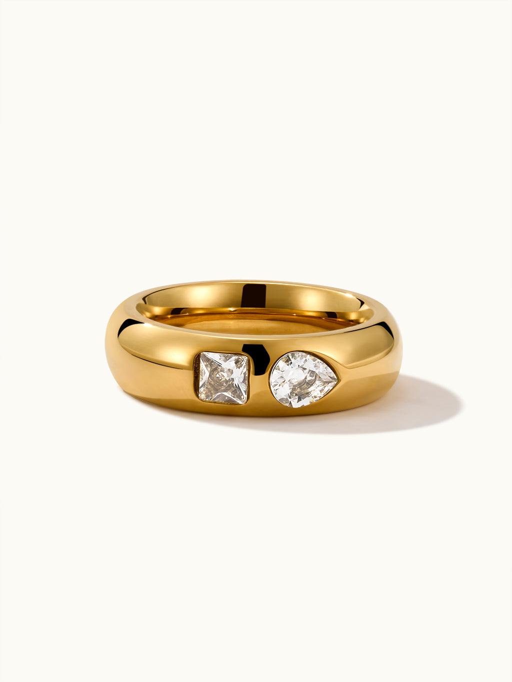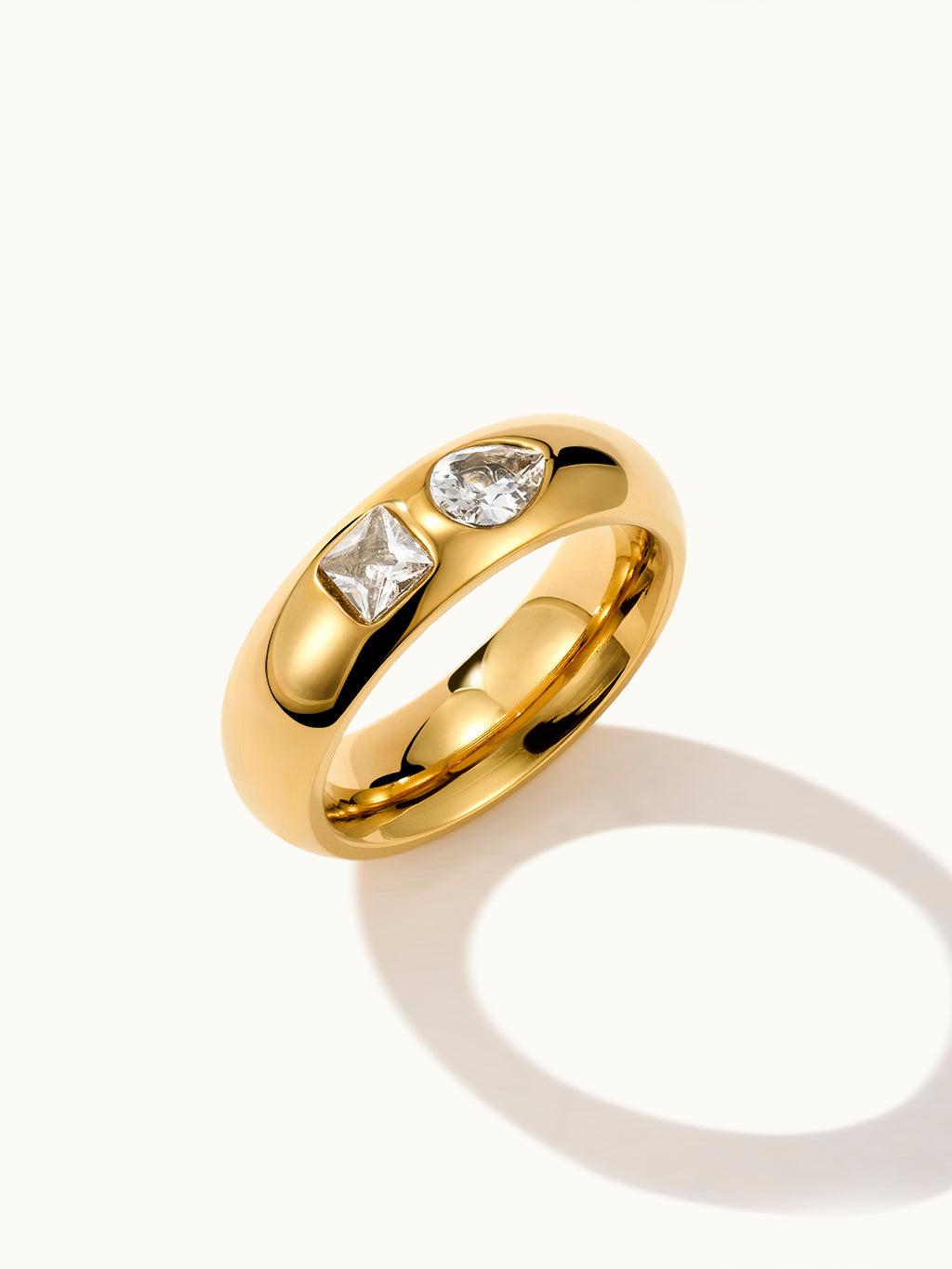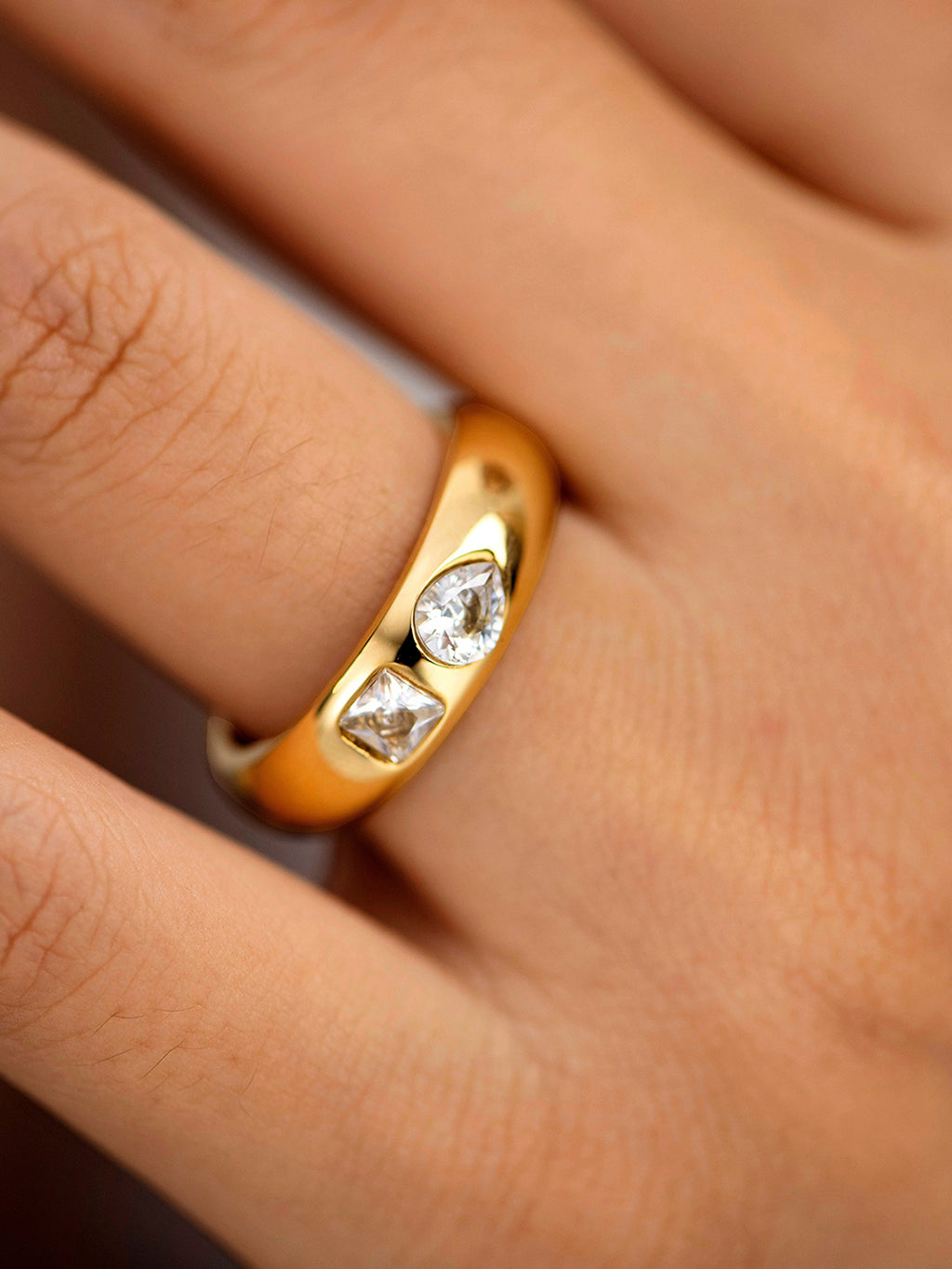 Der Two Stone Flush Set Ring besteht aus zwei funkelnden Steinen, die bündig auf einem glatten Band sitzen und so minimalistische Eleganz mit einem Hauch von Brillanz bieten.