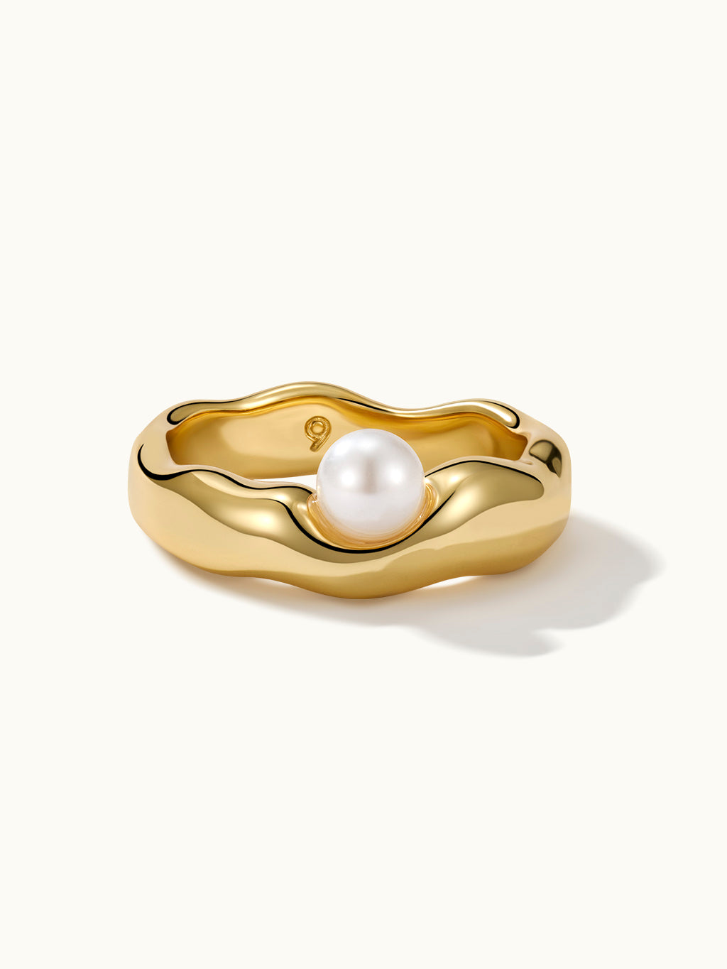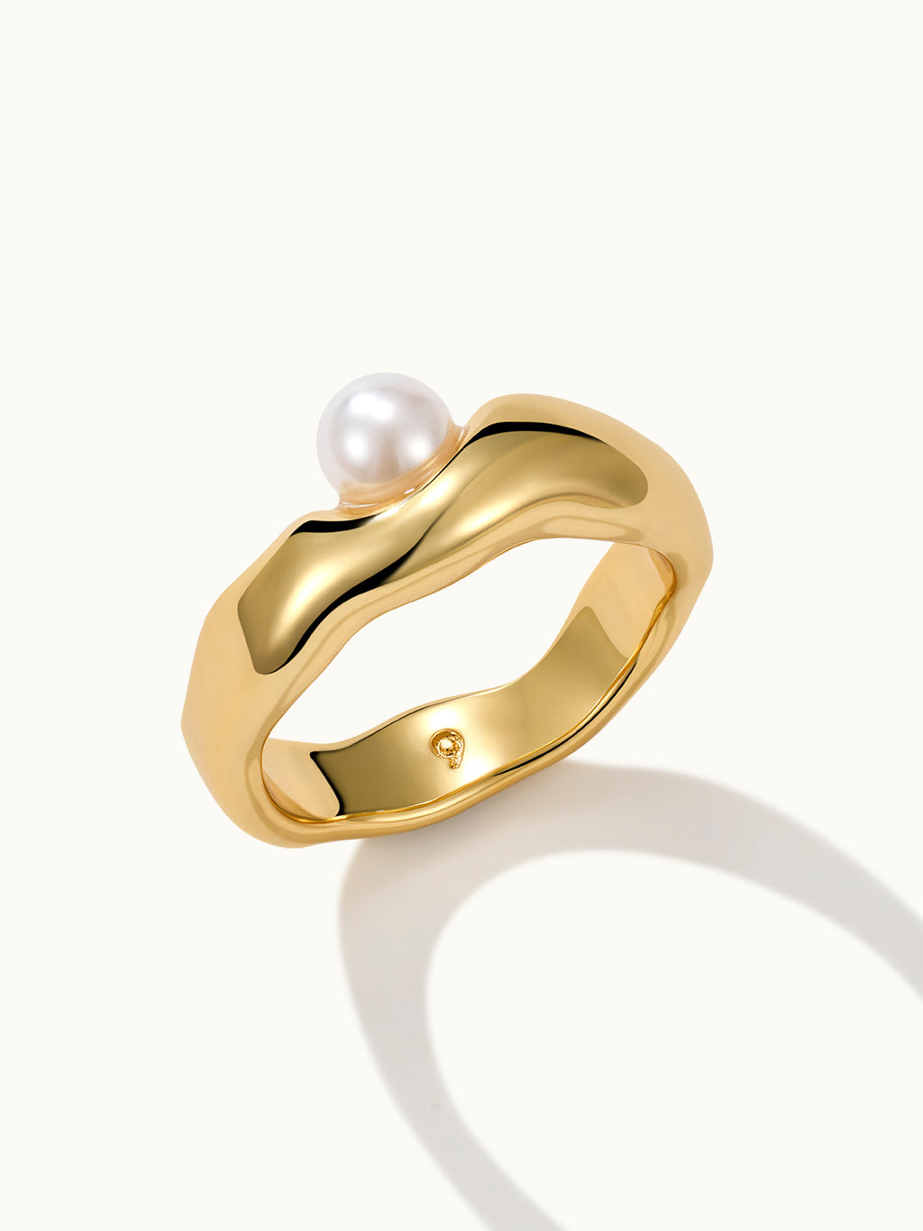 Der Wavy Pearl Ring zeichnet sich durch ein einzigartiges, fließendes Wellendesign aus, das durch eine glänzende Perle akzentuiert wird und jedem Look einen Hauch von Eleganz und moderner Raffinesse verleiht.