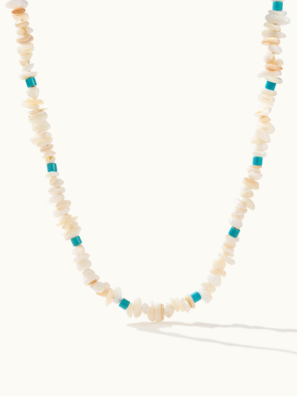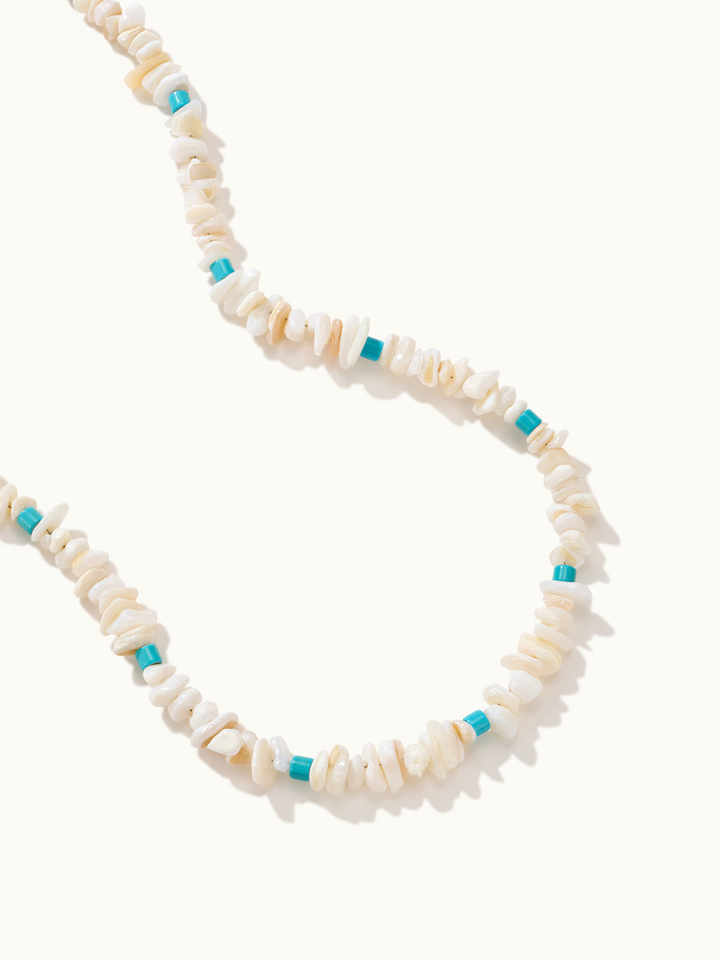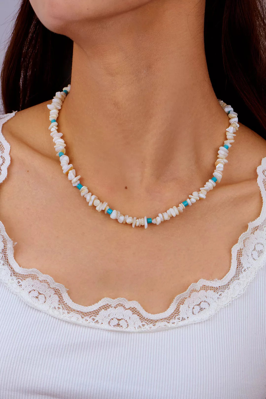 Erleben Sie die Eleganz der Küste mit dieser White Shell & Turquoise Kette, die die natürliche Schönheit der Muschel mit dem Charme von leuchtendem Türkis verbindet.