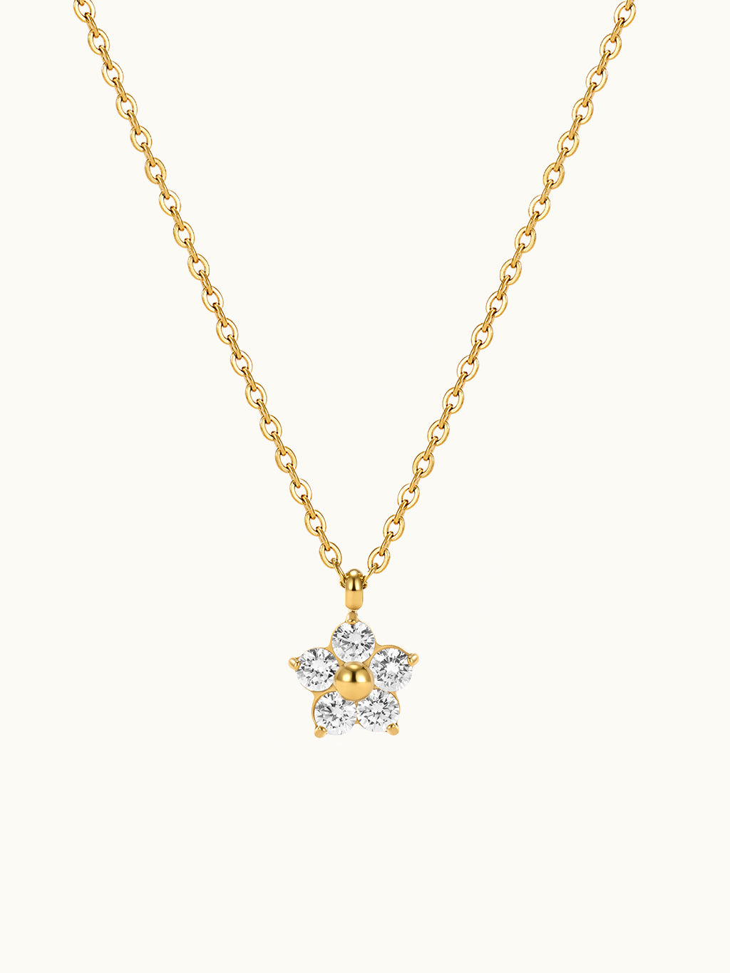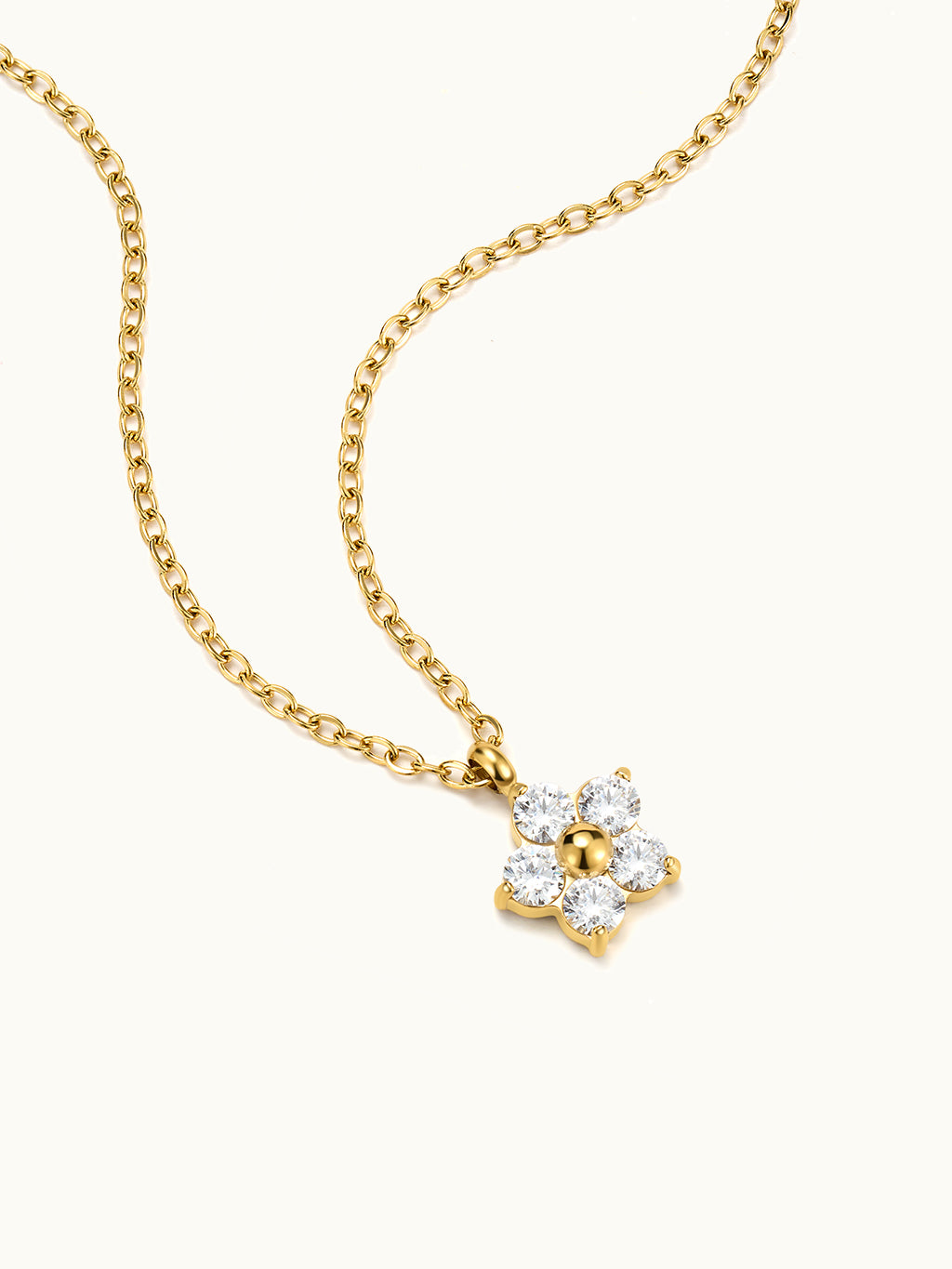 Betonen Sie Ihre Eleganz mit der Zircon Flower Pendant Kette. Mit seinem funkelnden Zirkonia-Blumendesign verleiht dieses zeitlose Schmuckstück jedem Outfit Charme.